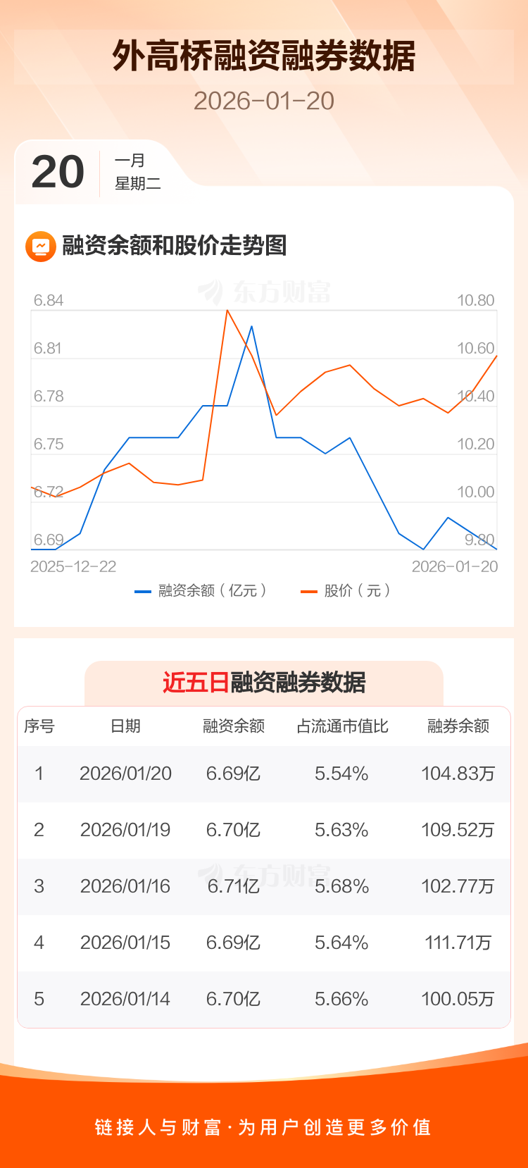 交易所最新数据显示,外高桥于2026年1月20日获融资买入649.37万元,融资偿还743.41万元,当日融资净偿还94.04万元。目前,该股融资余额6.69亿,占流通市值比例为5.54%。