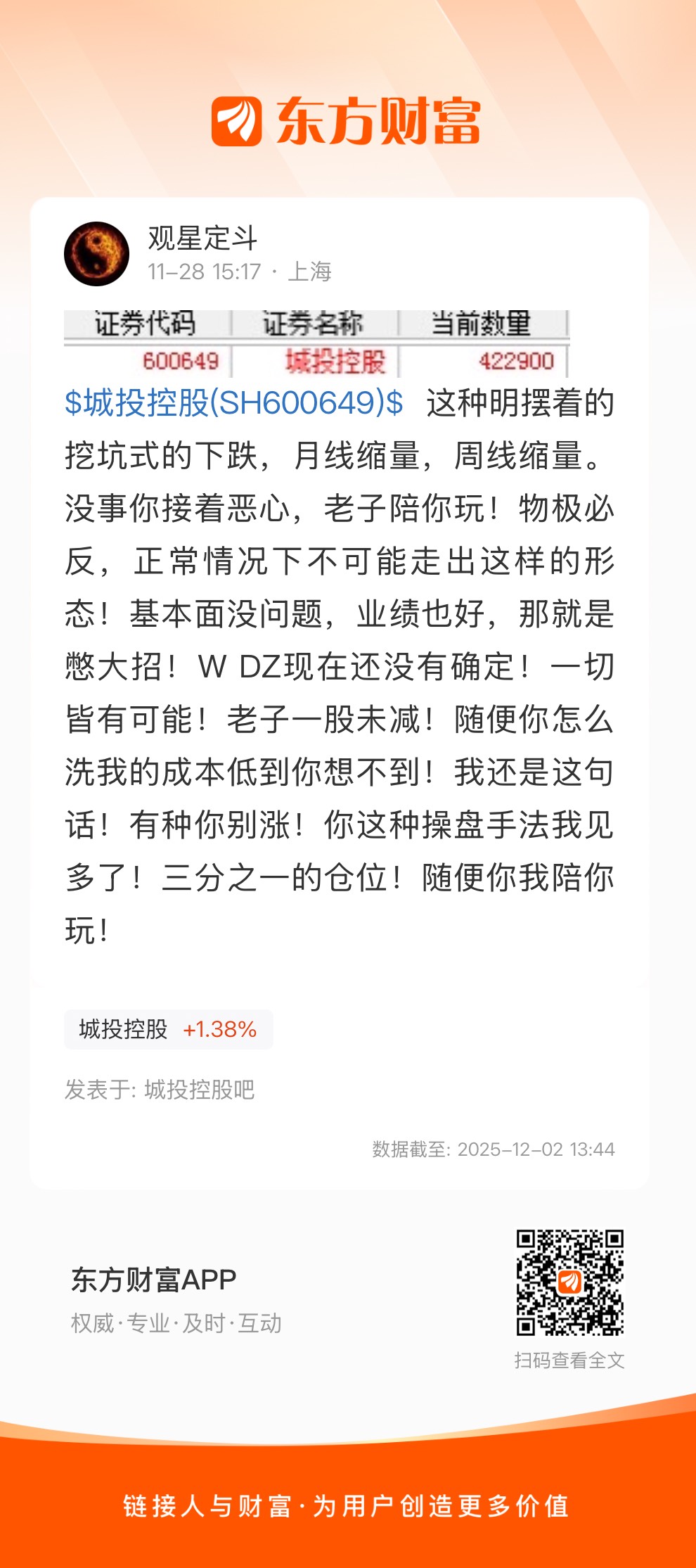 $城投控股(SH600649)$ 这种明摆着的挖坑式的下跌,月线缩量,周线缩量。没事你接着恶心,老子陪你玩!物极必反,正常情况下不可能走出这样的形态!基本面没问题,业绩也好,那就是憋大招!W DZ现在还没有确定!一切皆有可能!老子一股未减!随便你怎么洗我的成本低到你想不到!我还是这句话!有种你别涨!你这种操盘手法我见多了!三分之一的仓位!随便你我陪你玩!
