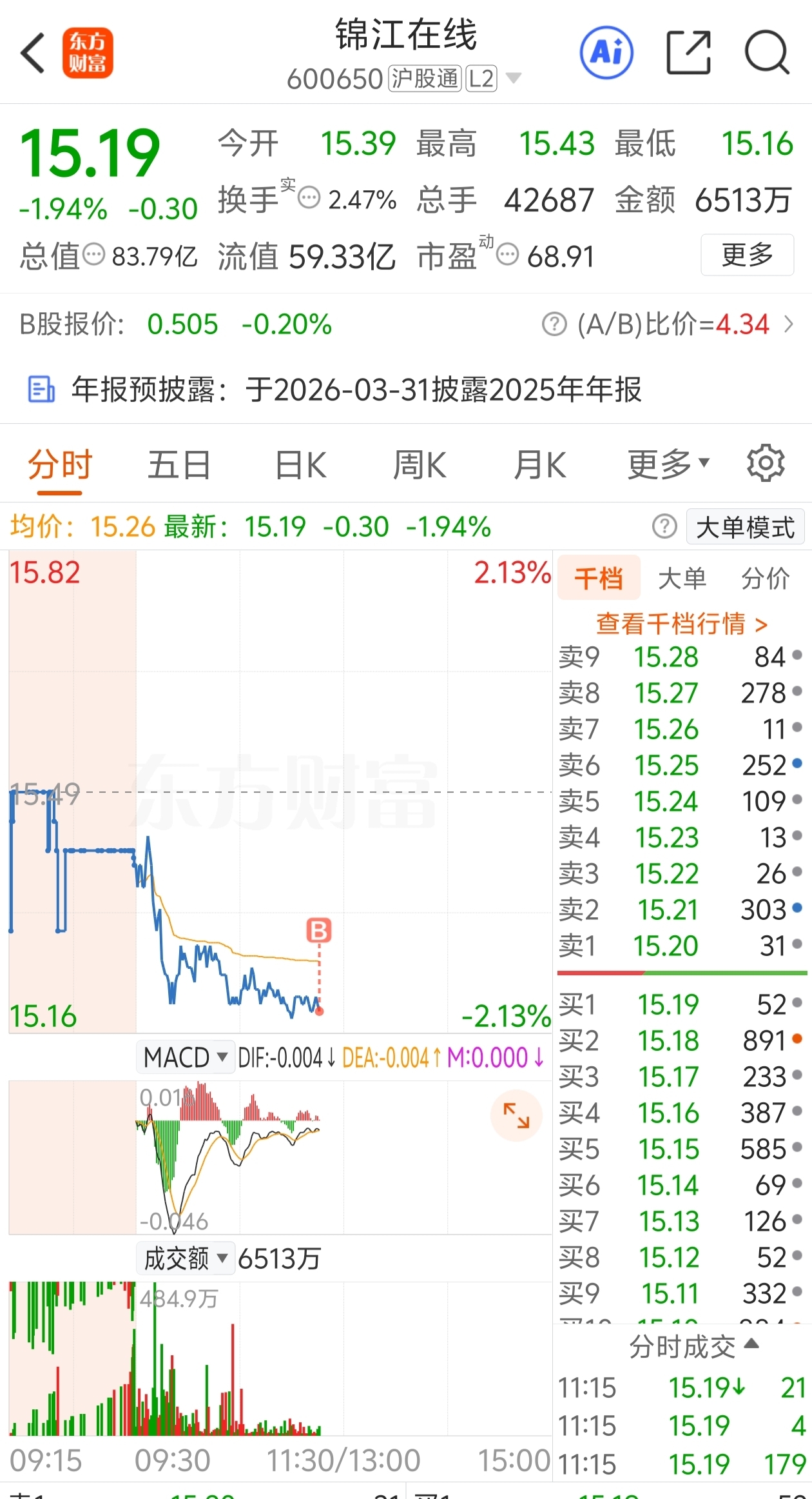 $锦江在线(SH600650)$ 上次15.50买后老觉得仓位低了,感谢主力让我补点货。