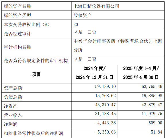 公告显示,根据上海申威资产评估有限公司出具的经有权国资监管部门授权机构备案的评估报告,截至2025年4月30日(评估基准日),上海日精仪器有限公司股东全部权益价值评估值为51,815.77万元。