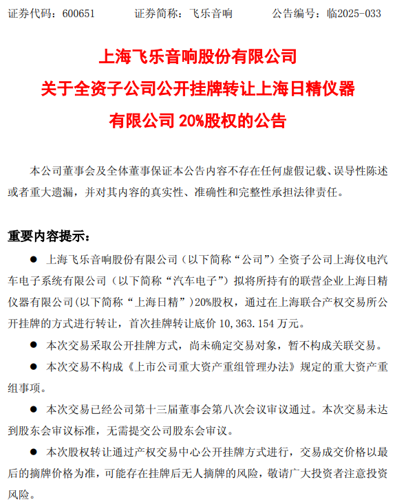 飞乐音响(600651)10月10日公告,全资子公司上海仪电汽车电子系统有限公司拟将所持有的联营企业上海日精仪器有限公司(简称“上海日精”)20%股权,通过在上海联合产权交易所公开挂牌的方式进行转让,首次挂牌转让底价1.04亿元。