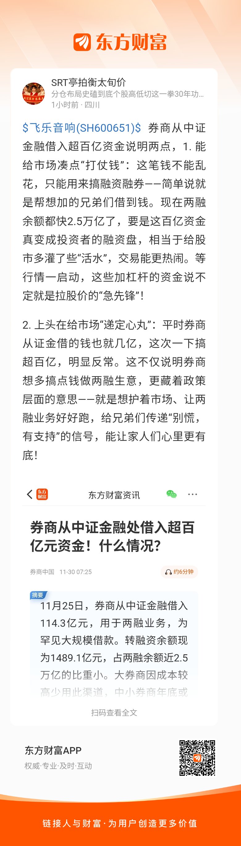 $飞乐音响(SH600651)$ 券商从中证金融借入超百亿资金说明两点,1. 能给市场凑点“打仗钱”:这笔钱不能乱花,只能用来搞融资融券——简单说就是帮想加的兄弟们借到钱。现在两融余额都快2.5万亿了,要是这百亿资金真变成投资者的融资盘,相当于给股市多灌了些“活水”,交易能更热闹。等行情一启动,这些加杠杆的资金说不定就是拉股价的“急先锋”!