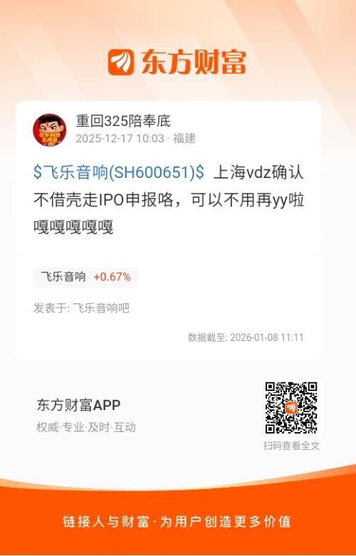 $飞乐音响(SH600651)$  上海vdz确认不借壳走IPO申报咯,可以不用再yy啦嘎嘎嘎嘎嘎