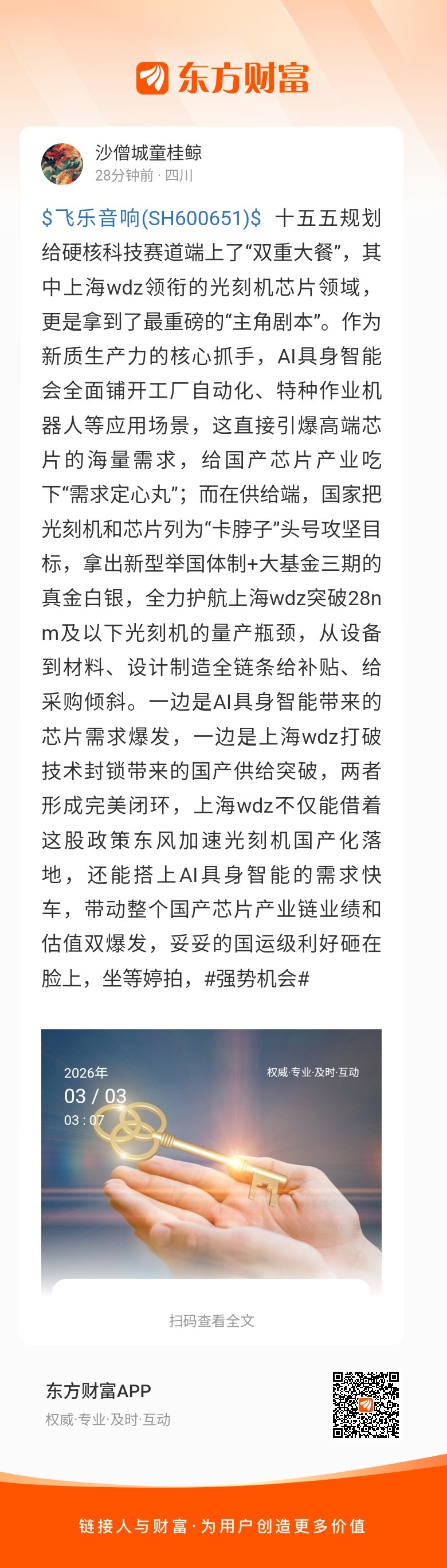 温馨提示: 1.根据《证券法》规定,禁止编造、传播虚假信息或者误导性信息,扰乱证券市场;2.用户在本社区发表的所有资料、言论等仅代表个人观点,与本网站立场无关,不对您构成任何投资建议。用户应基于自己的独立判断,自行决定证券投资并承担相应风险。《东方财富社区管理规定》