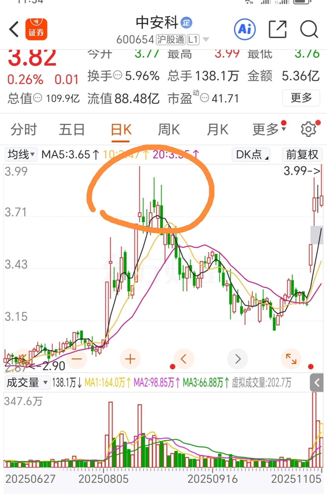$中安科(SH600654)$ 三天三条上影线都为了解放3.98<今天>,3.92<前天>和3.88<昨天>三个前高套牢盘,痕迹明显。