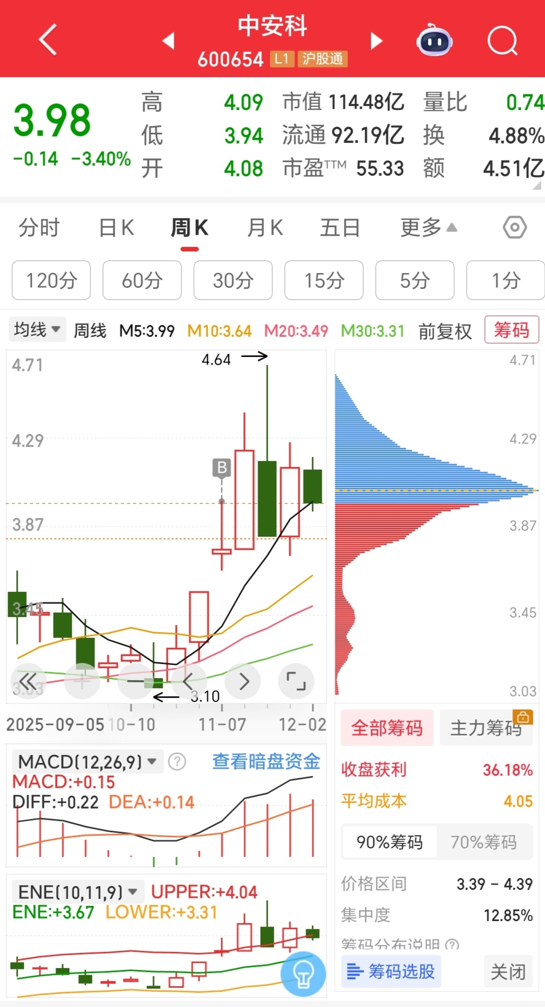 $中安科(SH600654)$ 缩量洗盘,趁大盘回调主力乘机再砸一砸,三元八至四元关口,反复磨了一个月,日筹码峰上下各峰逐渐向中间汇集,大家捆绑在一起,同一条战壕并肩战斗了,周筹码峰越来越尖,逐步形成一支匕首状,90%筹码集中度在12附近,接近最理想状态。