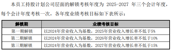 股权激励计划和员工持股计划对业绩的考核基本一致,公司层面仅仅考核营业收入的增长,第一个限售期(解锁期)的考核目标为:以2024年营业收入为基数,2025年营业收入增长率不低于5%;第二个限售期(解锁期)的考核目标为:以2024年营业收入为基数,2026年营业收入增长率不低于10%;第三个限售期(解锁期)的考核目标为:以2024年营业收入为基数,2027年营业收入增长率不低于15%。