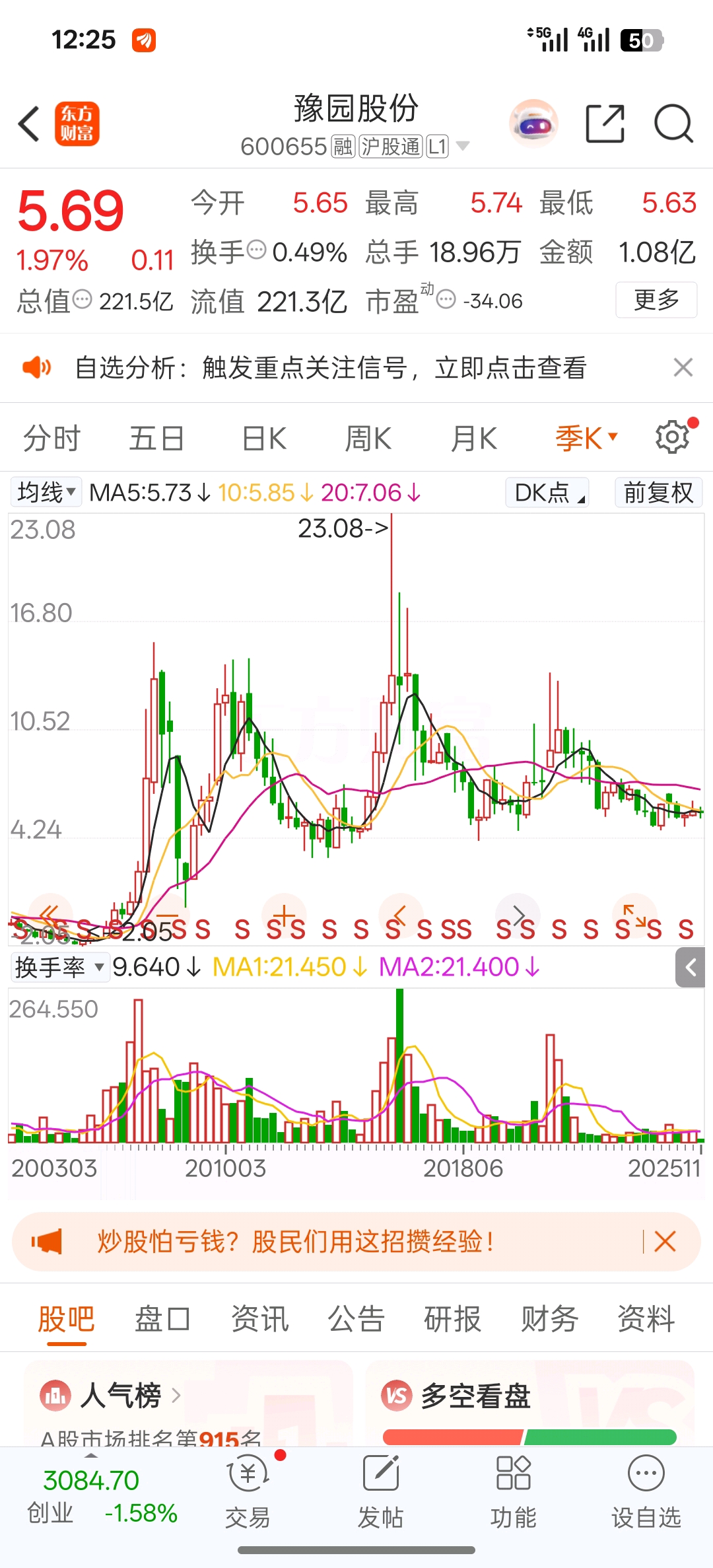$豫园股份(SH600655)$ 在这个位置机会多于风险,算是历史支撑点。每次都是5块钱附近启动。