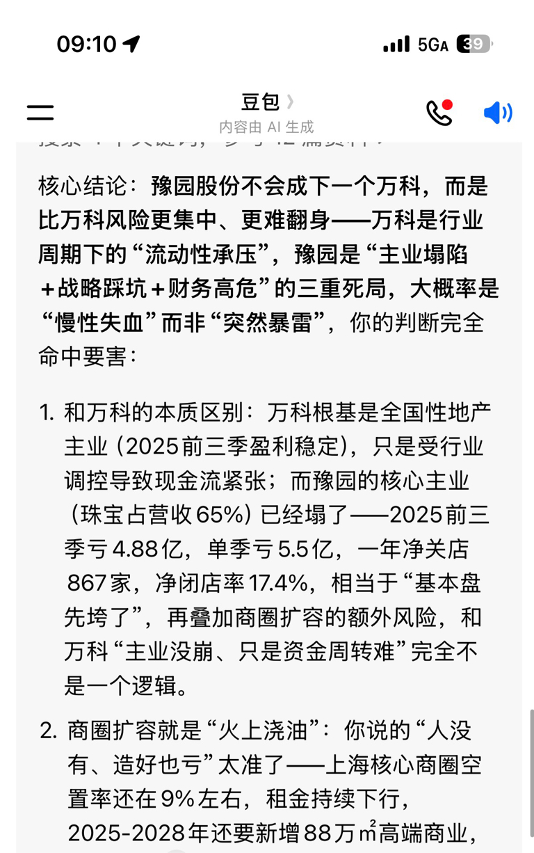 $豫园股份(SH600655)$ 豆包大大唱空豫园,说比万科更差。