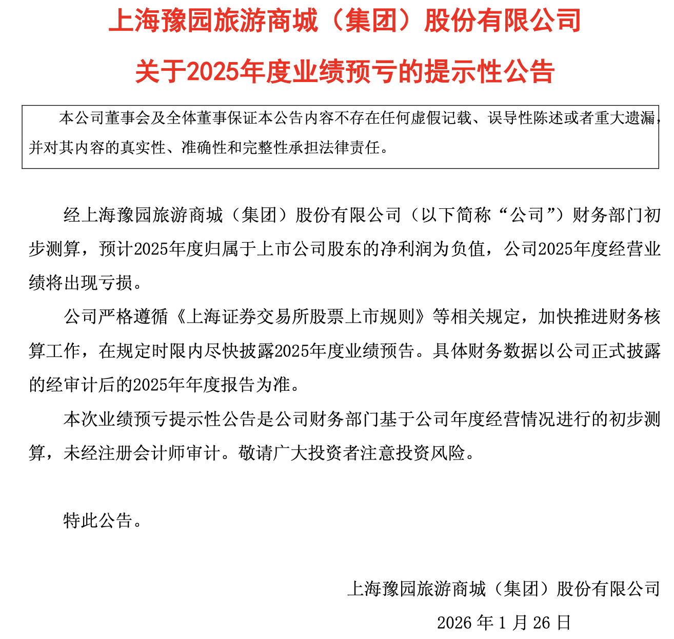 1月25日,豫园股份(600655)公告称,公司财务部门初步测算,预计2025年度归母净利润为负值,公司2025年度经营业绩将出现亏损。