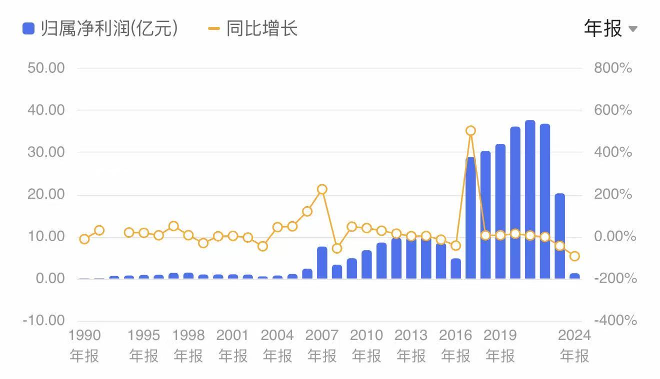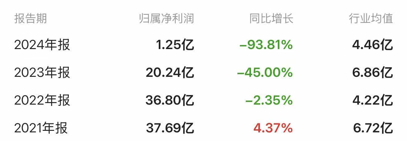 近年,豫园股份净利润断崖式下滑,从2021年的37.69亿元一路降至2024年的1.25亿元。