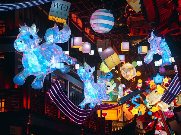 灯会突破传统观灯模式,构建起“可看可玩可沉浸”的节庆生态。每日傍晚,豫园中心广场的“马力全开·亮灯仪式”以说书人独舞、激昂鼓乐拉开序幕,千灯齐明瞬间点燃氛围;“一马当先·节庆巡游”中,非遗高跷木偶、机器小马与“天官赐福”“财神送宝”等主题场景流动上演,游客可随时加入收获惊喜;“以梦为马·定点演艺”带来江南舞韵、戏腔雅乐、皮影戏等精彩节目,福禄童子NPC穿行灯区送福,让年味触手可及。