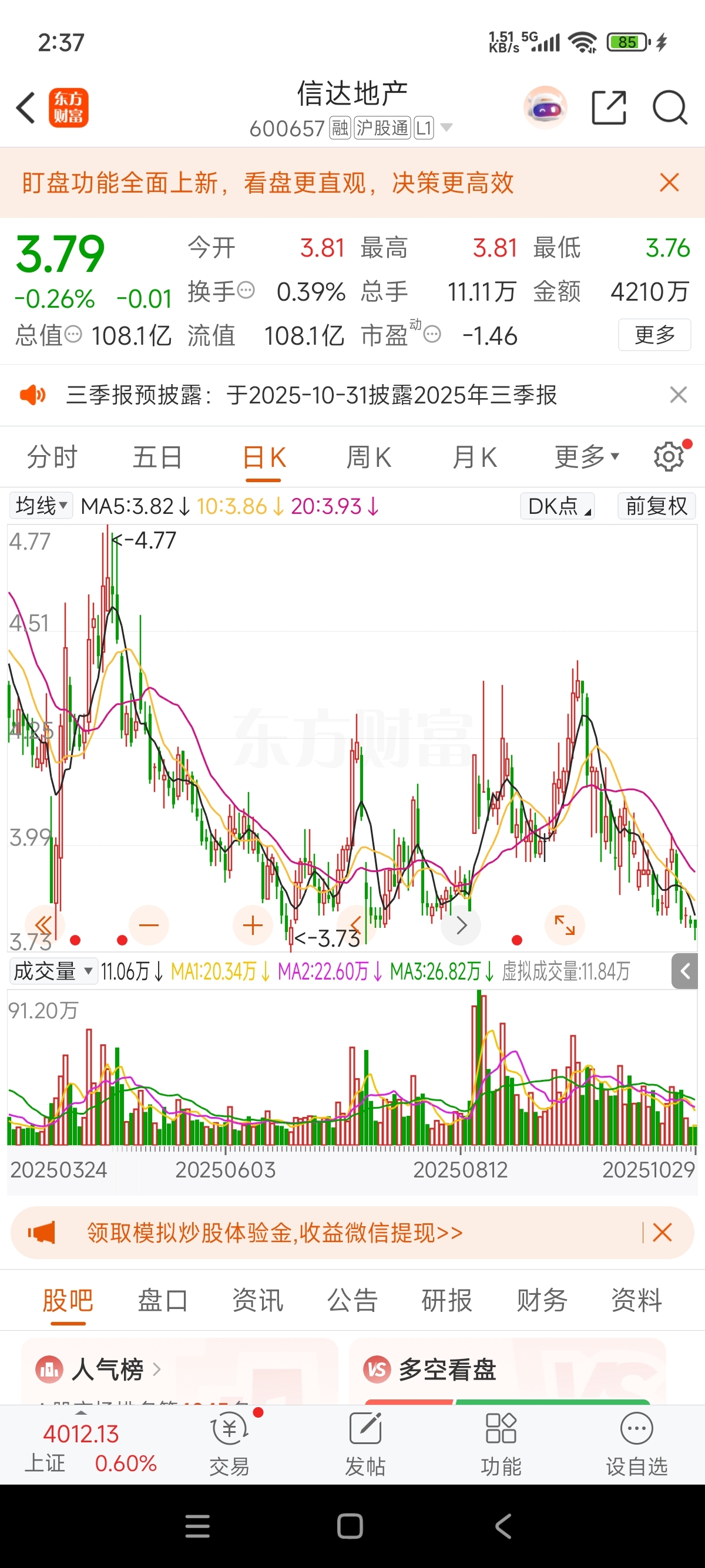$信达地产(SH600657)$ 看情况,被控盘的稳稳的,破前低3.73稳稳的,就是不知道第三季度亏损出来要跌多少个点