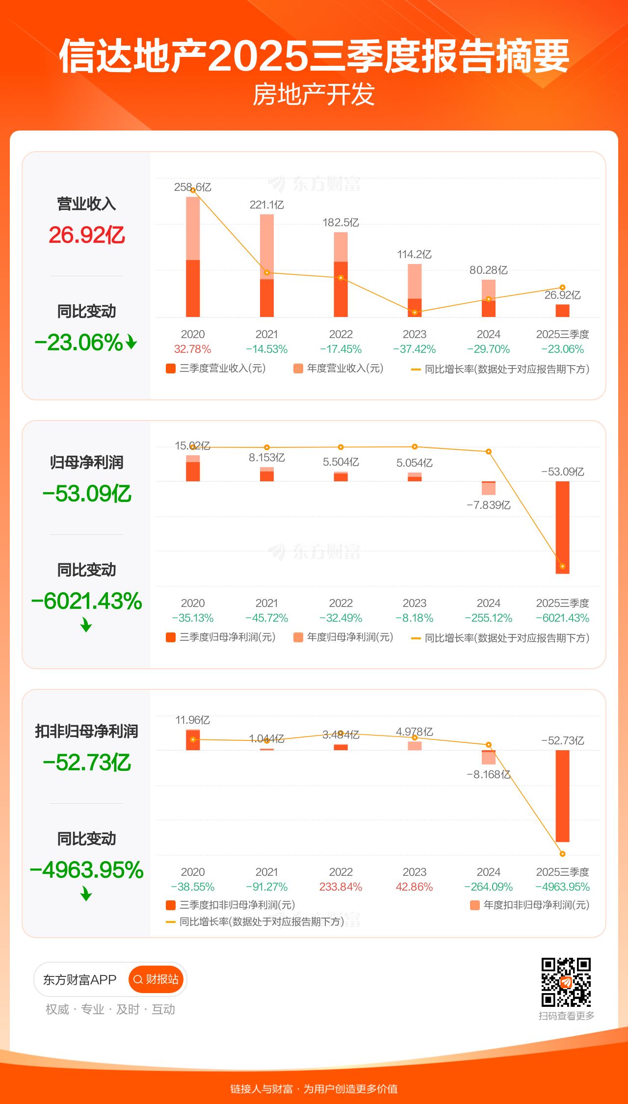图解财报:信达地产前三季归母净利润-53.09亿元,上年同期-8672.71万元