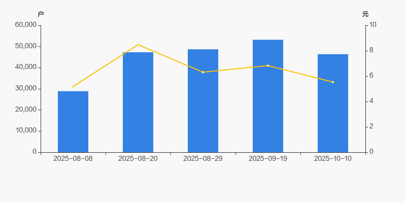 2025年8月8日至今,公司股东户数显著大幅增长,区间涨幅达60.56%。2025年8月8日至2025年10月10日区间股价上涨6.76%。