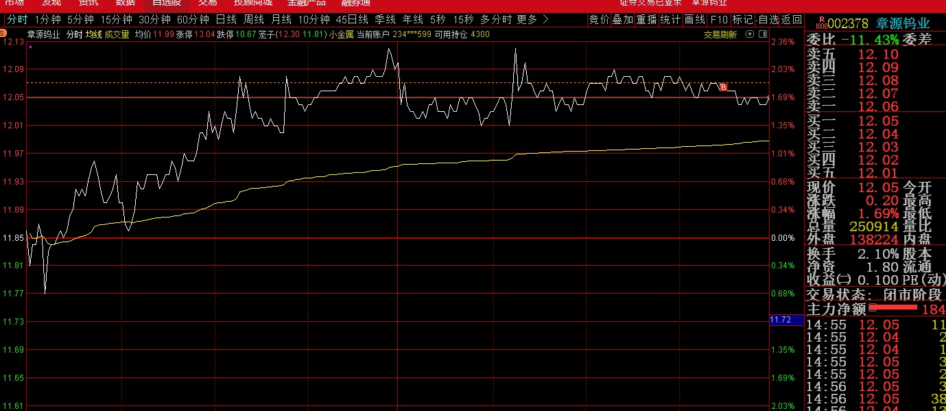 尾盘买了章源钨业,因为钨价今天涨幅还可以。每吨涨幅三千,钨价好像止跌重新开始上涨。