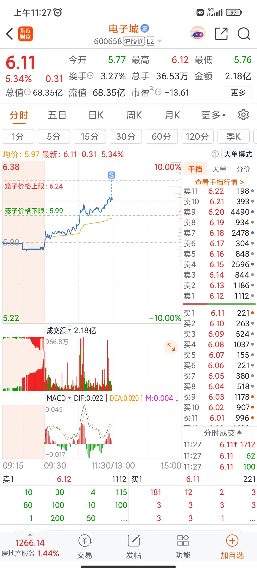 $电子城(SH600658)$ 掰掰了,拉及股,拉个涨停都没有,走势磨磨唧唧,不可能有高度,6.11卖出,赚10%止盈