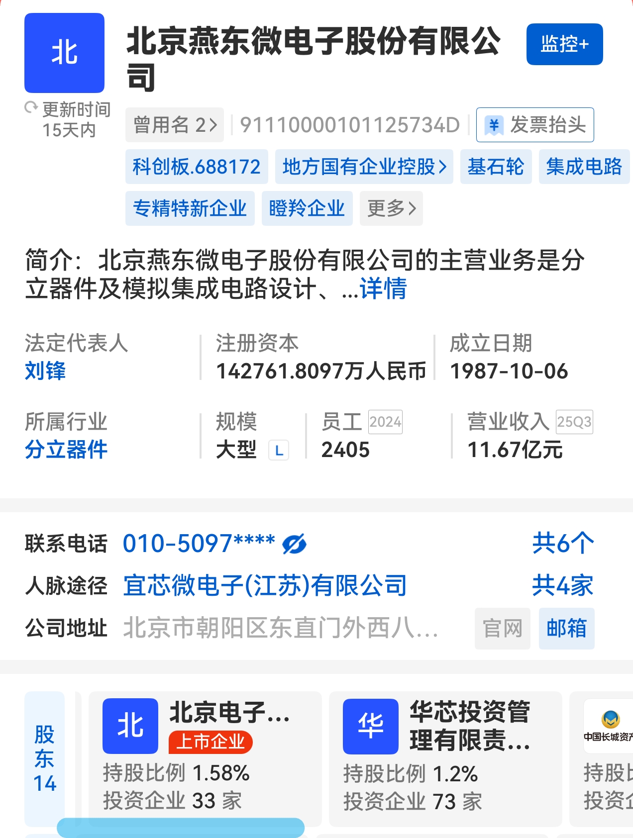 600658电子城持有688172燕东微2260万流通股(第7大股东,占1.58