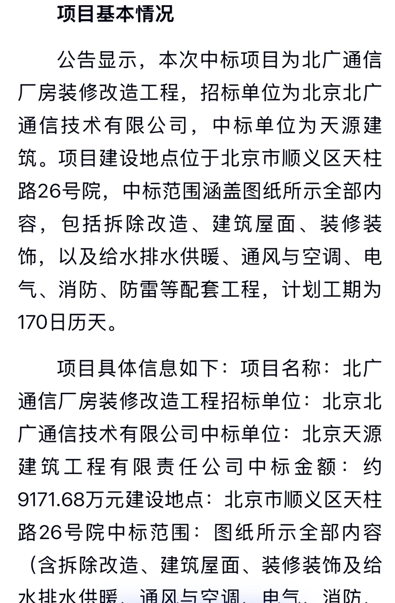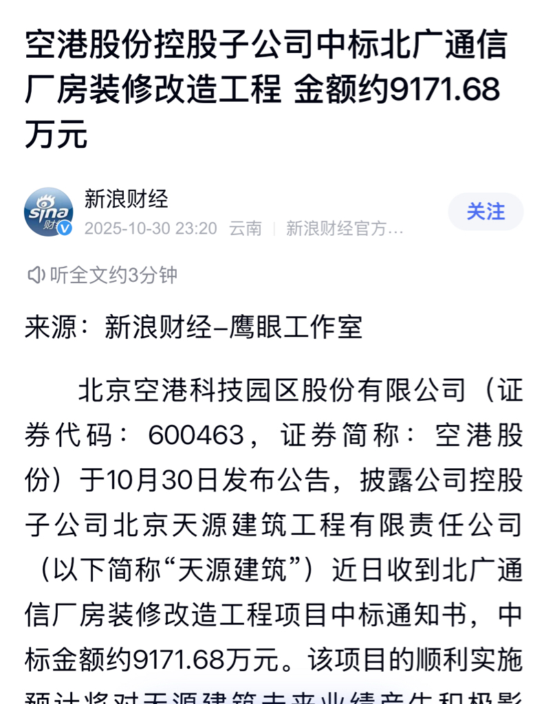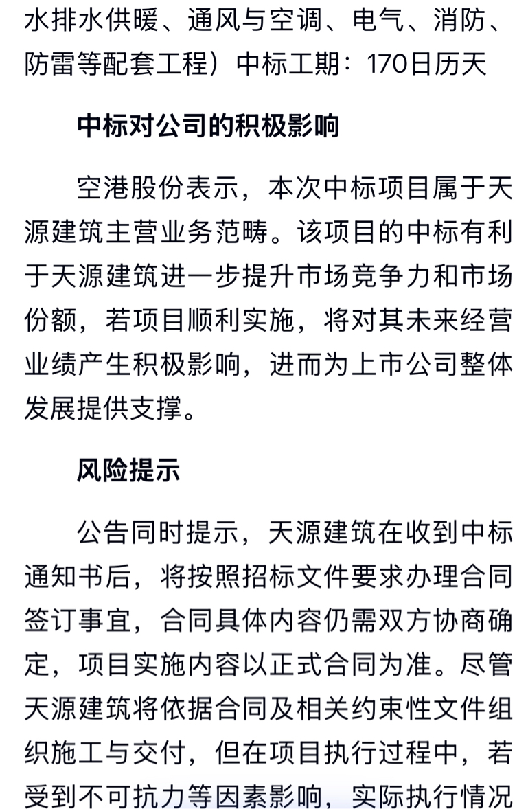 $电子城(SH600658)$ 刚去翻了,2025年10/30招标书,中标单位为空港股份下面的北京天源建筑,中标金额为9171.68……工期170天