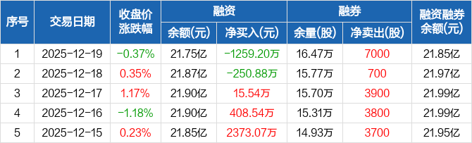 福耀玻璃:融资净偿还1259.2万元,融资余额21.75亿元(12-19)