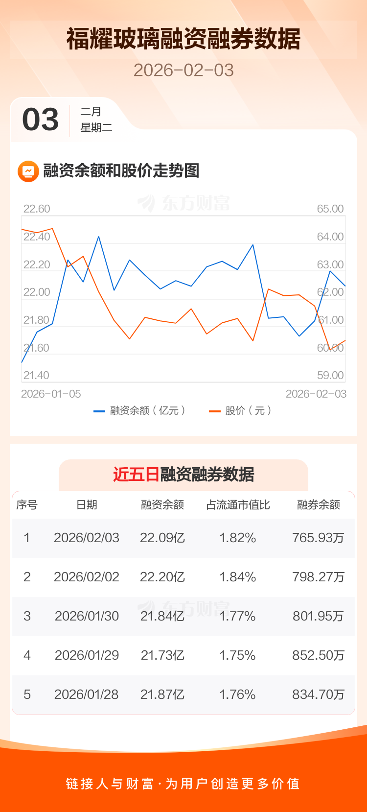交易所最新数据显示,福耀玻璃于2026年2月3日获融资买入3130.63万元,融资偿还4260.04万元,当日融资净偿还1129.41万元。目前,该股融资余额22.09亿,占流通市值比例为1.82%。