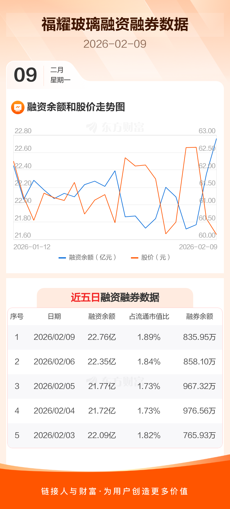 交易所最新数据显示,福耀玻璃于2026年2月9日获融资买入8224.16万元,融资偿还4163.95万元,当日融资净买入4060.21万元。目前,该股融资余额22.76亿,占流通市值比例为1.89%。