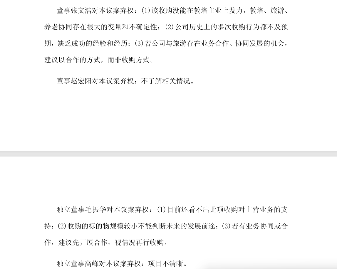 对此,昂立教育在回复上交所问询函时透露,4名董事投出弃权票的理由包括收购的标的物规模较小不能判断未来的发展前途、项目具体经营情况不够清晰等。公司高度重视相关董事提出的意见,已就其发表的弃权意见分别充分深入沟通,就其关切的核心问题进行了详细的解释与说明并取得理解。