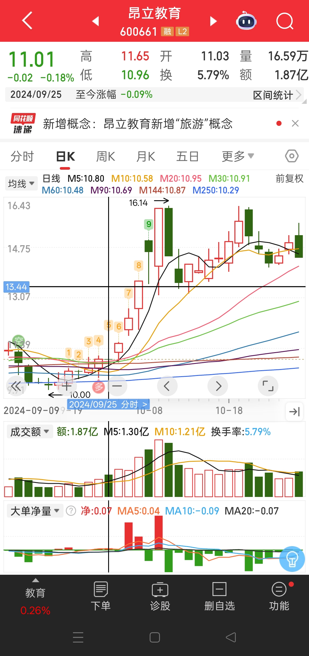 昂立教育2024年9月25日股价11.01,2026年2月9号股价11.02再出