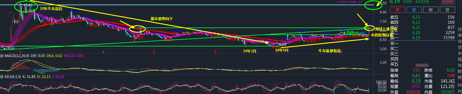 外服只是上升途中的一次周线级别压制回落,不代表后期就此不涨,可以通过周线图能看出其趋势已然发生较大变化,日线快速拉升再快速回落,很可能代表主力筹码已经基本收集完毕,是主升浪中的前期震仓阶段,通过较大的波动来快速震仓充分换手,最起码以周线级别来看,回落仍然是寻找上车的机会,周线的第一目标仍然是周线前高10.5附近才会有稍微强力的周线洗盘,目前只能看做是日线级别洗盘,洗盘力度有限
