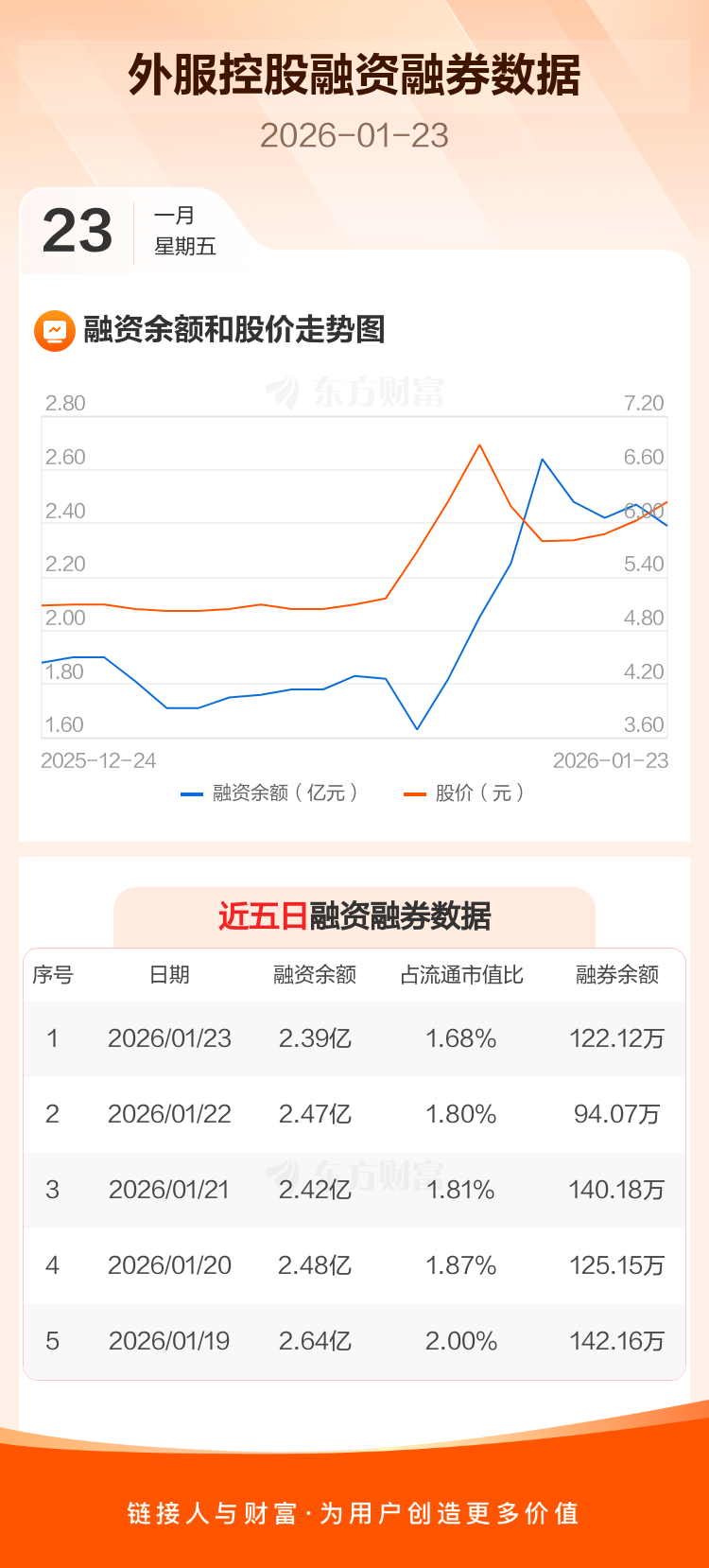 交易所最新数据显示,外服控股于2026年1月23日获融资买入4284.41万元,融资偿还5047.45万元,当日融资净偿还763.05万元。目前,该股融资余额2.39亿,占流通市值比例为1.68%。
