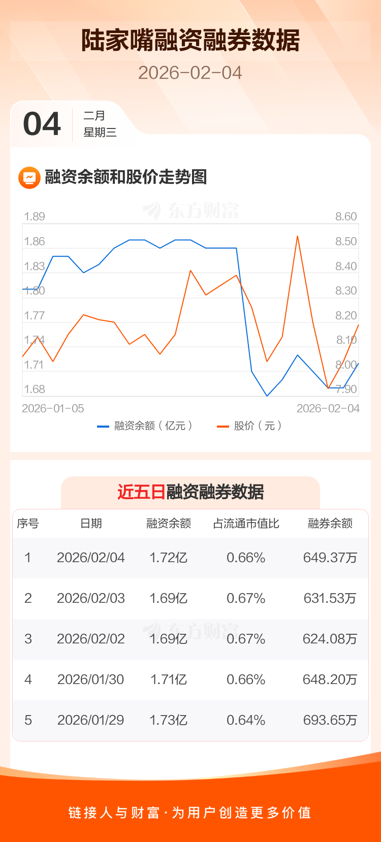 交易所最新数据显示,陆家嘴于2026年2月4日获融资买入869.84万元,融资偿还581.59万元,当日融资净买入288.25万元。目前,该股融资余额1.72亿,占流通市值比例为0.66%。