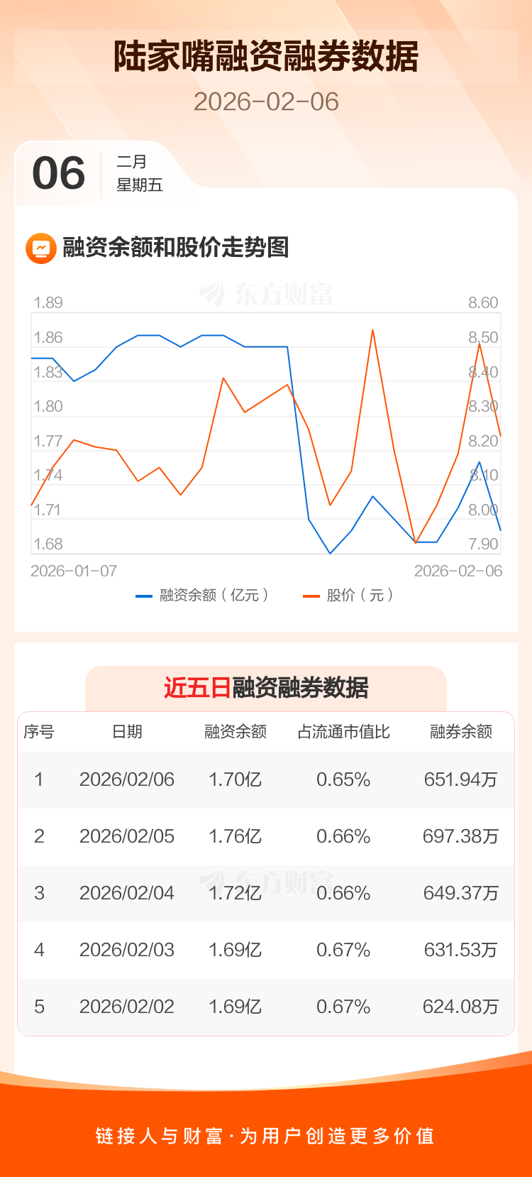 交易所最新数据显示,陆家嘴于2026年2月6日获融资买入1111.55万元,融资偿还1690.34万元,当日融资净偿还578.78万元。目前,该股融资余额1.70亿,占流通市值比例为0.65%。
