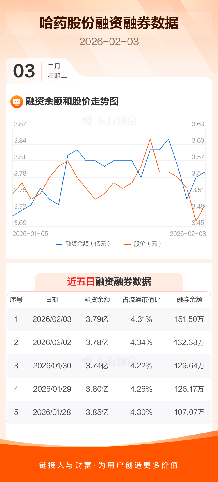 交易所最新数据显示,哈药股份于2026年2月3日获融资买入673.64万元,融资偿还622.52万元,当日融资净买入51.12万元。目前,该股融资余额3.79亿,占流通市值比例为4.31%。