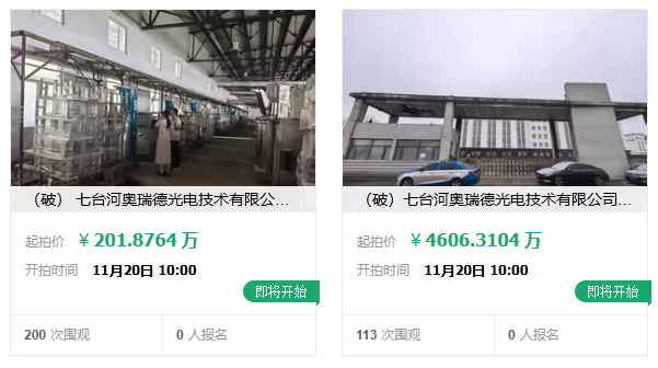 七台河奥瑞德光电,分两次拍卖,合计做价4800万。