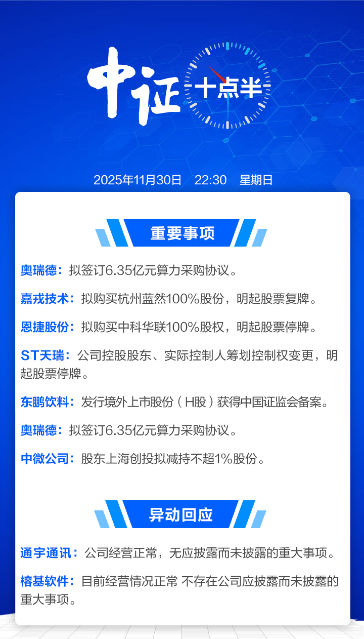 【中证十点半】奥瑞德拟签订6.35亿元算力采购协议;嘉戎技术明起复牌
