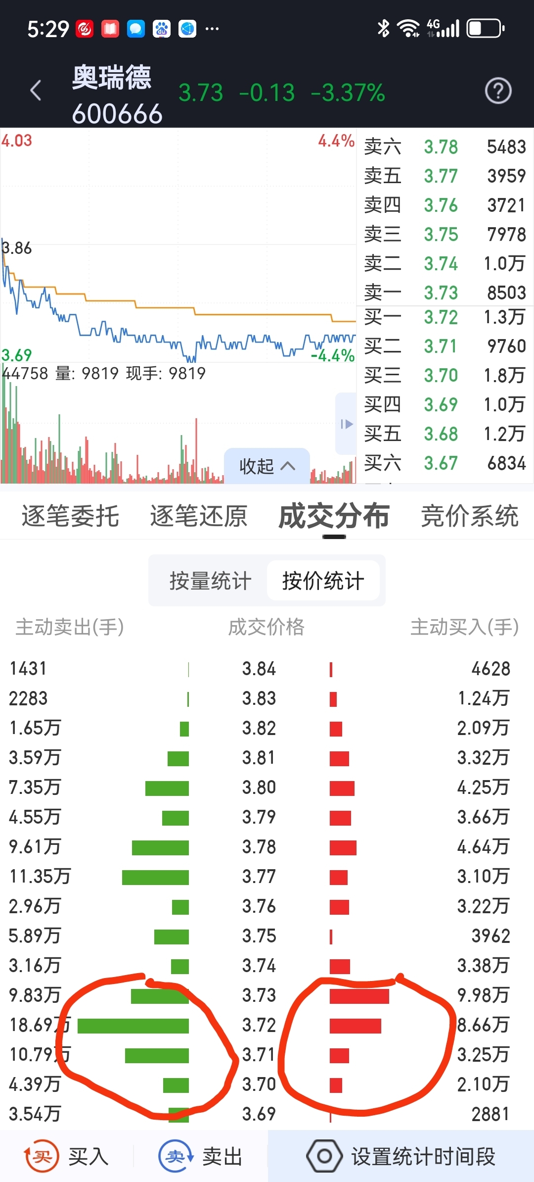 3.71-3.73元主动卖出39万手,主动买入22万手,相差17万手,被洗出去不