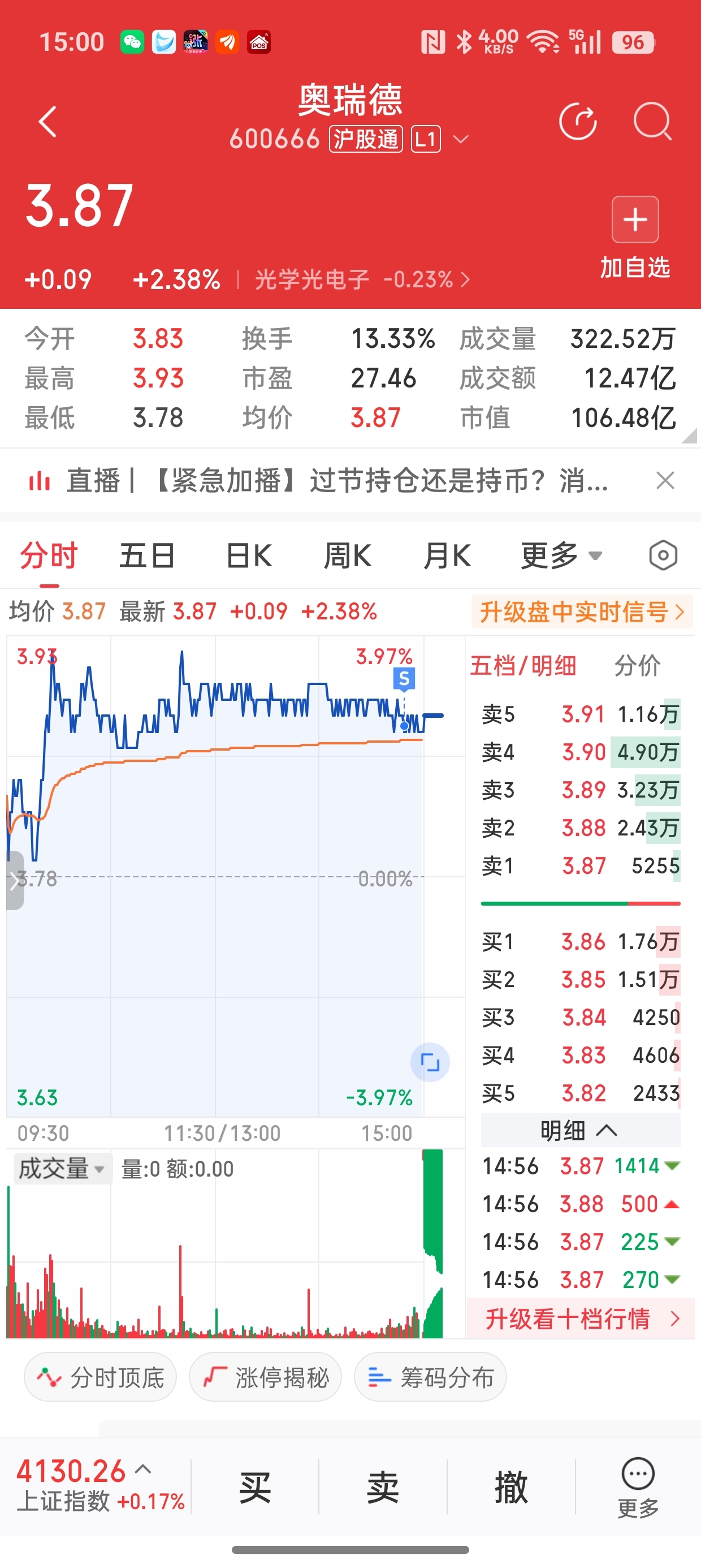 冲不上3.9!还是压力山大,大盘缩量,板块轮动很快,所以先跑了