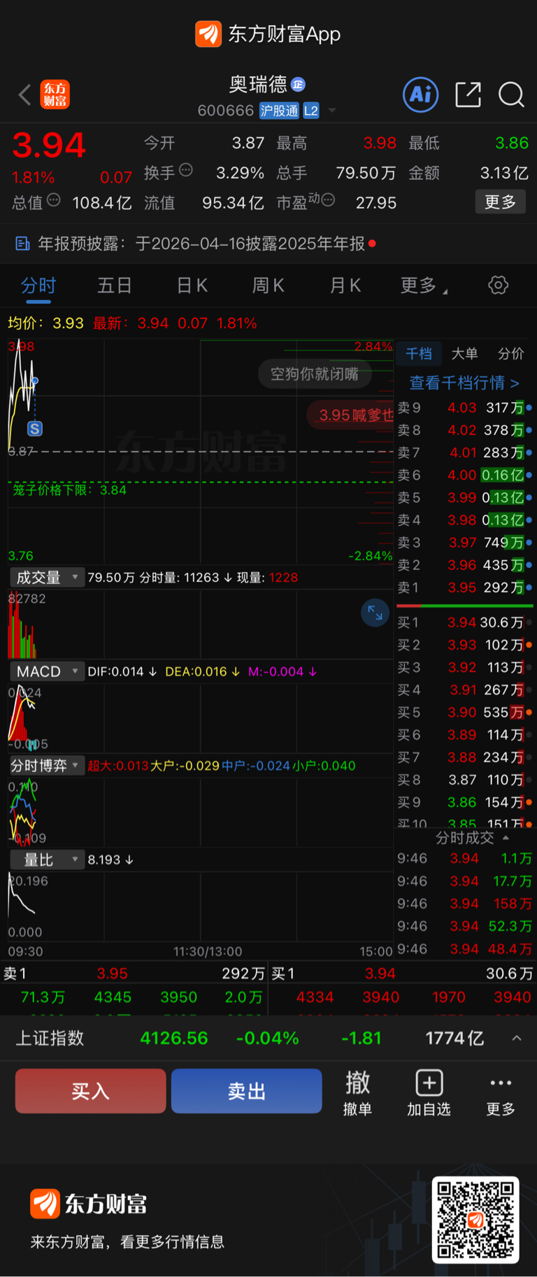 $奥瑞德(SH600666)$ 留下发财 过了4元在加速