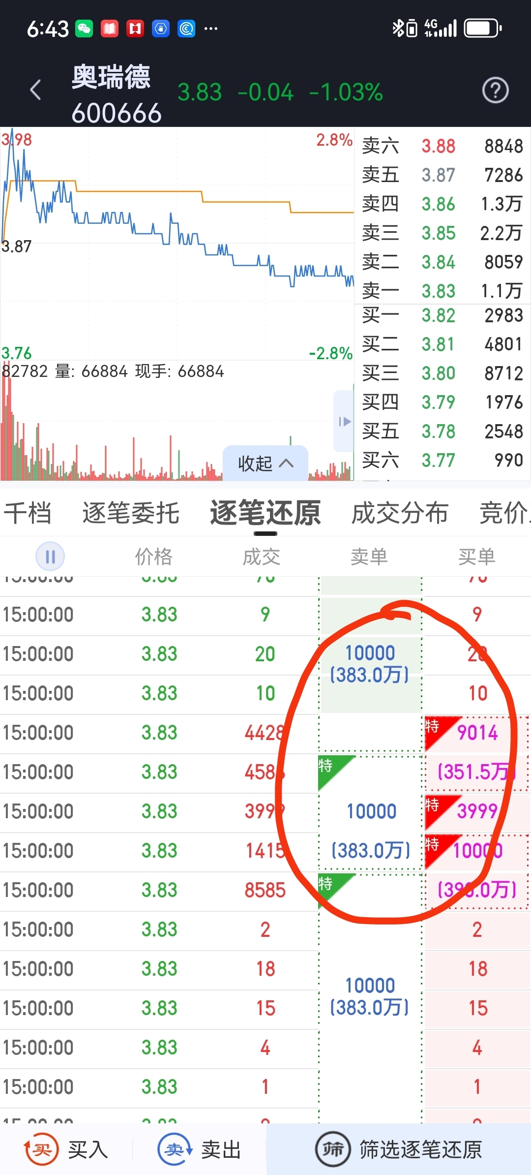 瑞德昨天尾盘六笔万手大单对倒