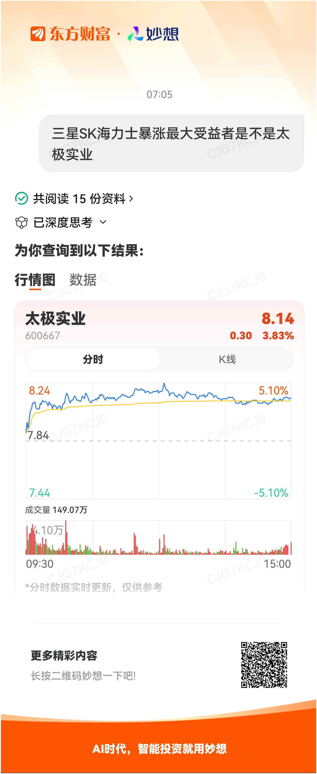 妙想一下:三星SK海力士暴涨最大受益者是不是太极实业,下周开盘太极实业可能直接涨