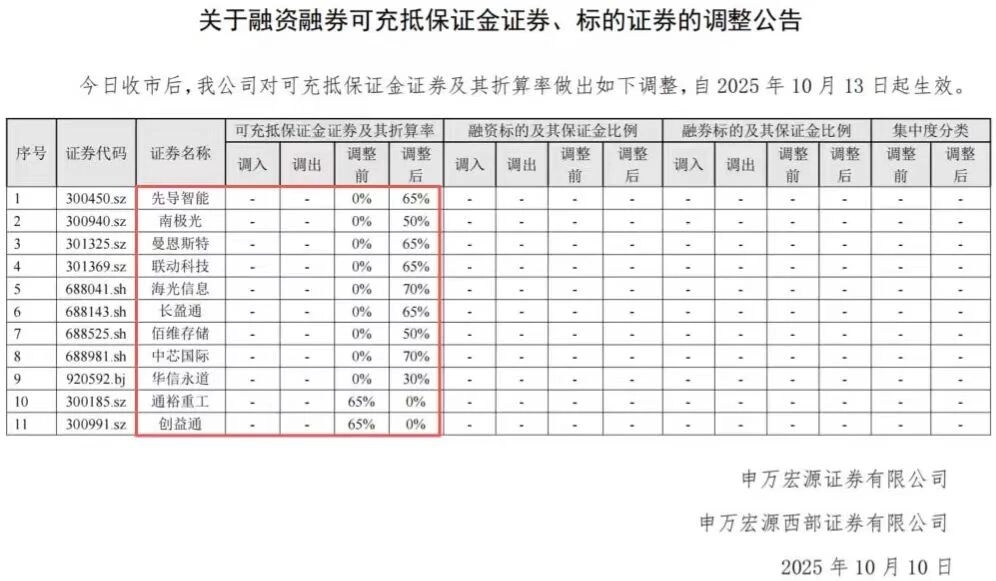 申万宏源融资融券可充抵保证金证券、标的证券的调整公告