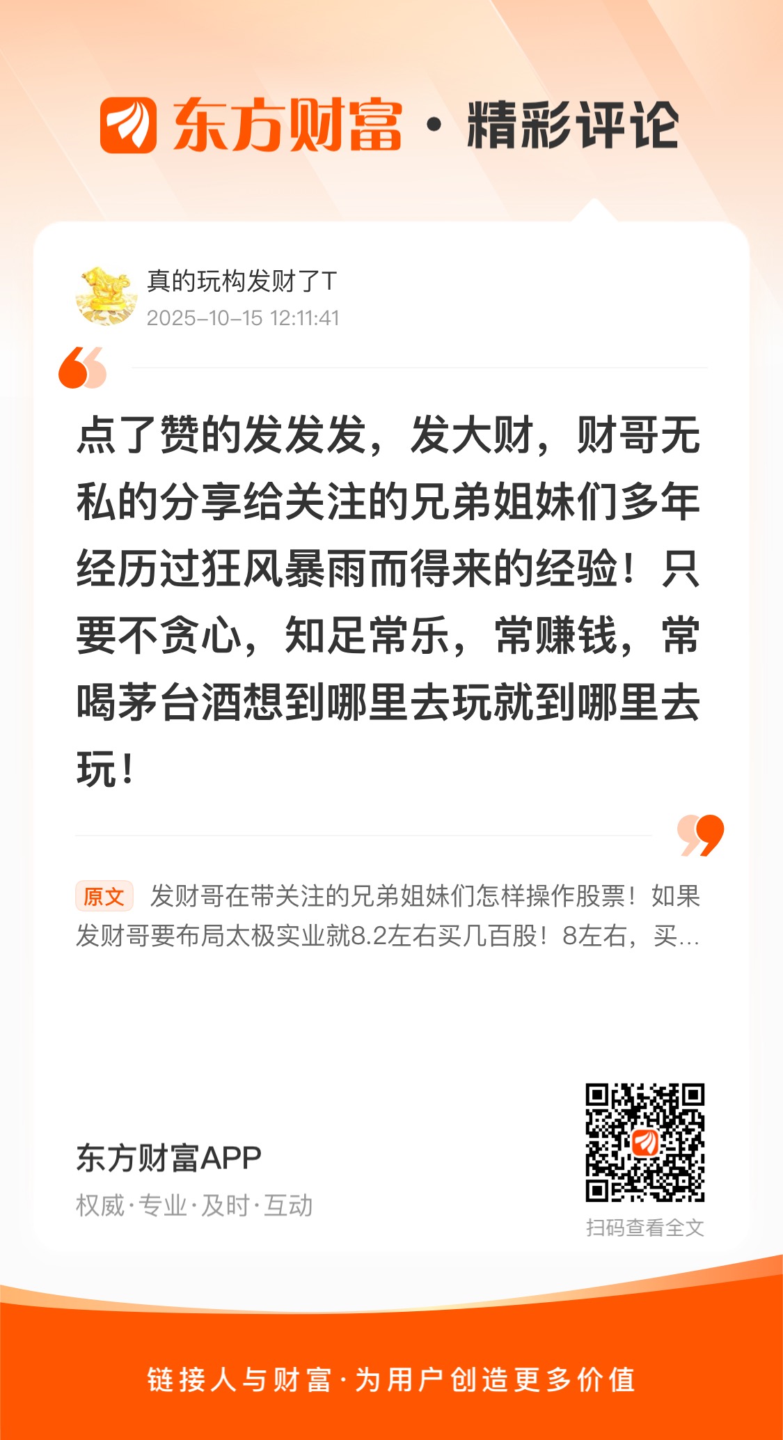 点了赞的发发发,发大财,财哥无私的分享给关注的兄弟姐妹们多年经历过狂风暴雨而得来的经验!只要不贪心,知足常乐,常赚钱,常喝茅台酒想到哪里去玩就到哪里去玩!(发财哥才开始炒股那两年就是因为贪心经常做过山车,到最后还是没有赚到钱!后面改掉了那个坏习惯!就从10几万赚到了现在的几百万!发财哥准备带着关注的兄弟姐妹们早日实现八位数的目标而努力中!