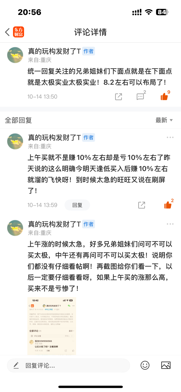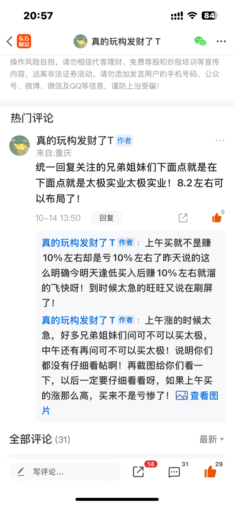 $太极实业(SH600667)$ 点赞的都是看了贴的都不会亏钱而且还赚到钱了!点了赞的以后买票都发发发,发大财,一起来!所以有些朋友没有细看帖,往往会亏钱赚钱!发财哥都是提前一两天说的呀,再次截图给大家看,请看截图,你们的日期是多少就知道了,还有时间是多少就知道了擎天昨天都有铁的证据说不能买太极!什么价位买都是提前说的!今天看来又提前说对了!