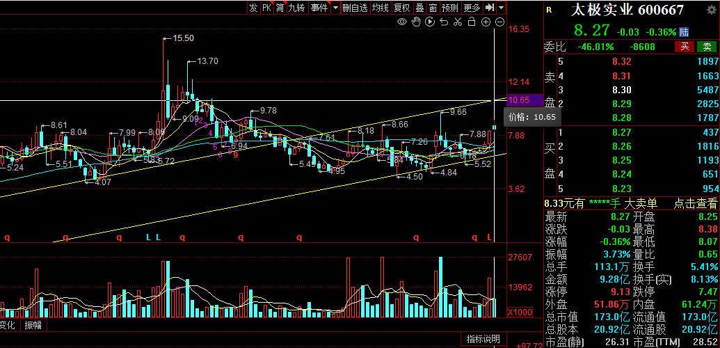 @太极实业这个月线图形标准的很,等到11左右再卖。或许这次还会突破压力线,涨到1