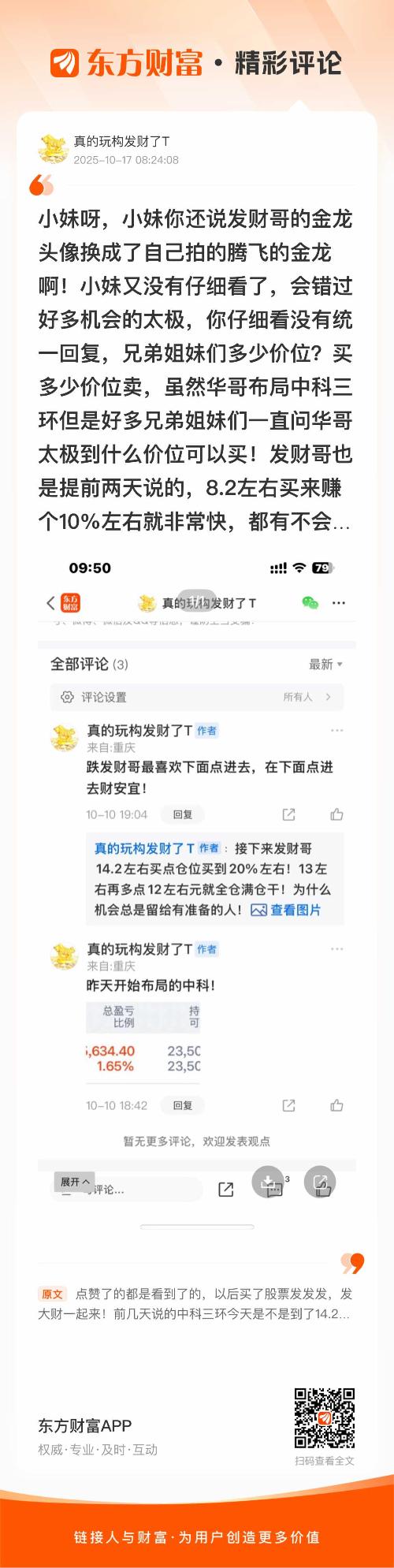 //@真的玩构发财了T : 回复 随心愿满 :小妹呀,小妹你还说发财哥的金龙头像换成了自己拍的腾飞的金龙啊!小妹又没有仔细看了,会错过好多机会的太极,你仔细看没有统一回复,兄弟姐妹们多少价位?买多少价位卖,虽然华哥布局中科三环但是好多兄弟姐妹们一直问华哥太极到什么价位可以买!发财哥也是提前两天说的,8.2左右买来赚个10%左右就非常快,都有不会说话的贴的证据呀!再次截图给你看一看,中科三环10月10日说的!以后要仔细看贴呀,错过了就是错过了赚钱的机会!