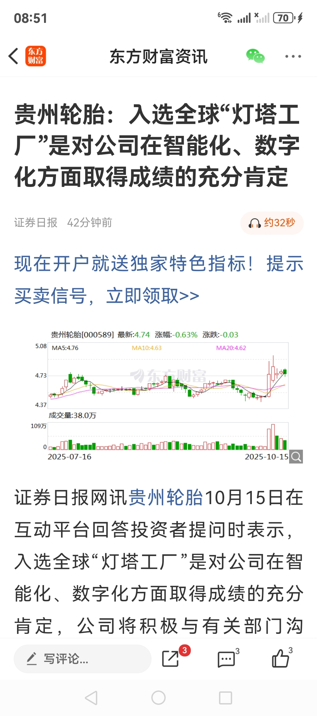 $太极实业(SH600667)$ 贵州轮胎000589三季报业绩0.33元, 全年业绩0.47元,明年业绩0.6元!中线必到7元以上。 十五五规划,工业4.0智能制造。贵州轮胎000589入选全球制造业领域智能制造和数字化最高水平的“灯塔工厂”称号。
