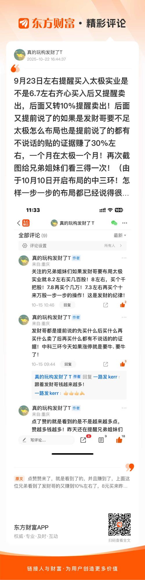 9月23日左右提醒买入太极实业是不是6.7左右齐心买入后又提醒卖出,后面又转10%提醒卖出!后面又提前说了的如果是发财哥要不足太极怎么布局也是提前说了的都有不说话的贴的证据赚了30%左右,一个月在太极一个月!再次截图给兄弟姐妹们看三得一次!(由于10月10日开启布局的中三环!怎样一步一步的布局都已经说得很清楚了,也可以随便去查!并且还说了买了后涨到20左右就卖!10月10日说的结了好几次涂料,有些兄弟姐妹们一直问什么地方买什么价位买)