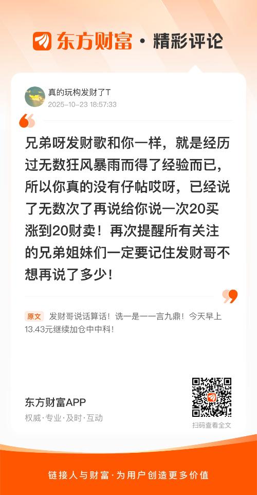 发财哥说话算话!诜一是一一言九鼎!今天早上13.43元继续加仓中中科!