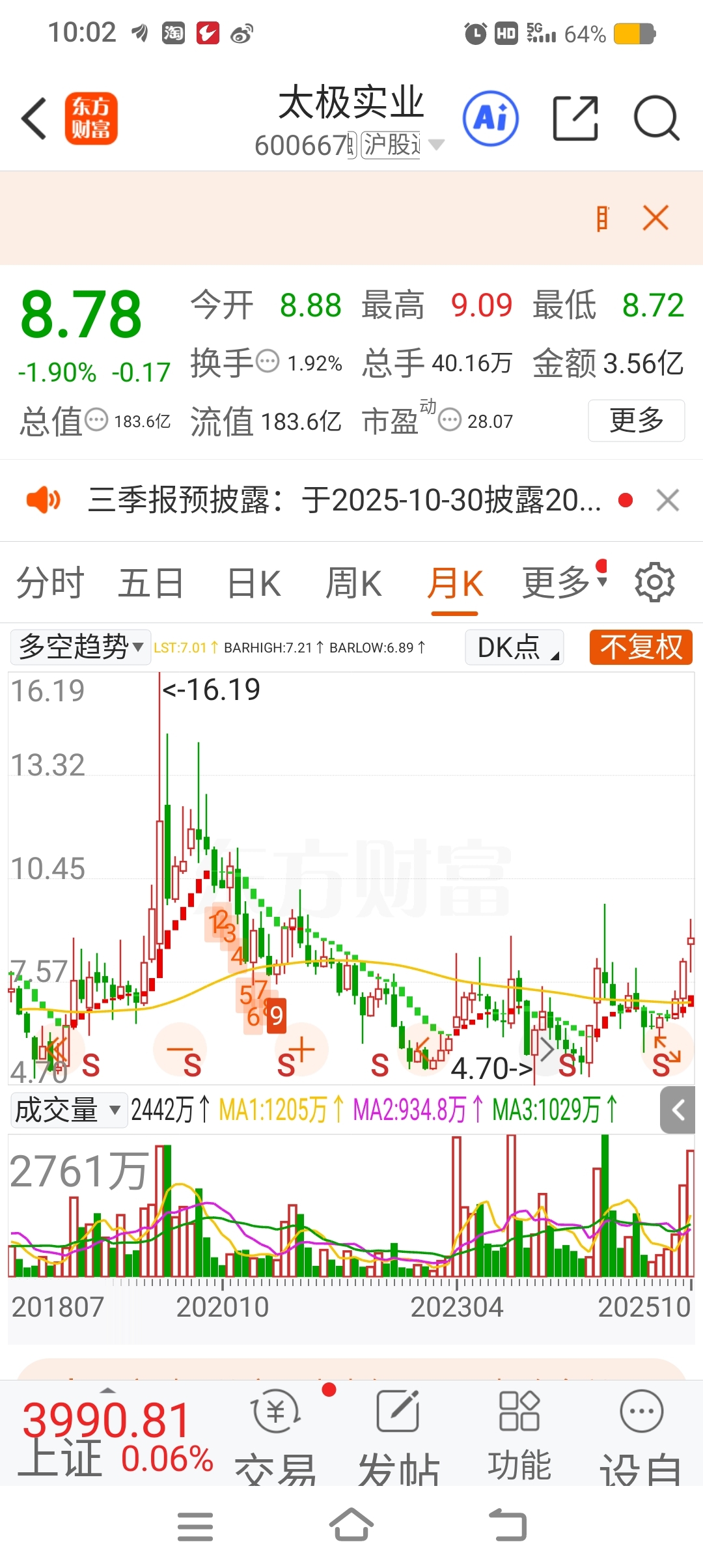 $太极实业(SH600667)$ 太极实业的游资们,你们使劲跌,使劲杀,直接搞退市,反正我不会卖出去的,我可以熬到太极实业退市,看看月线,好像还在底部,距离以往高点还有一倍的空间,主力你使劲跌,我可以熬的起。