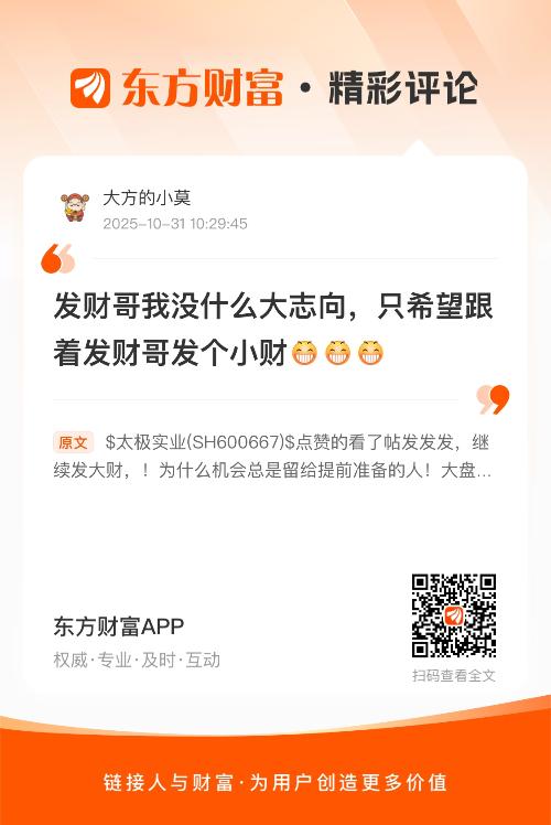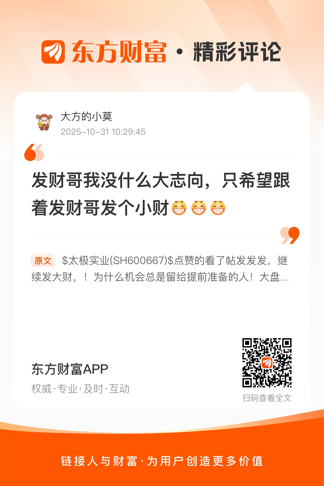 $太极实业(SH600667)$ 点赞的看了帖发发发,继续发大财,!为什么机会总是留给提前准备的人!大盘及个股为什么都比较听发财哥的!在为兄弟是认认真真看了发财哥今年的帖子都知道华哥在什么价位买了9元左右的时候就知道发财哥会8.5毛几买!今天是10月31日大方小方明年一定会跟着发财,哥早日实现财富自由的机会!